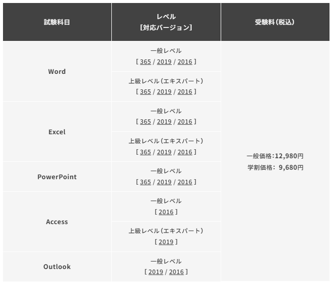 Microsoft Office Specialist 受験するには 受験料・価格 から引用