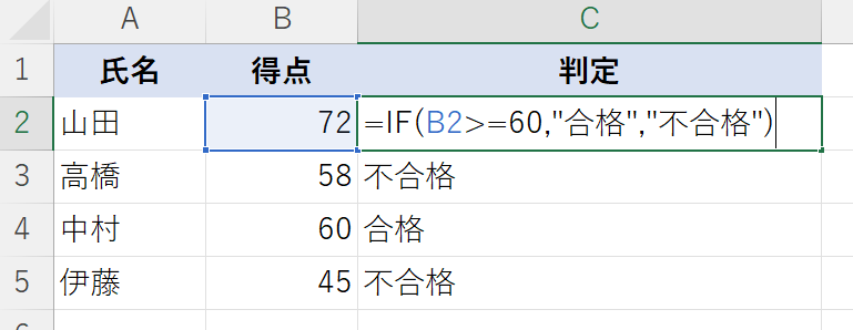 田中80=IF(B2>=60,”合格”,”不合格”) → 合格