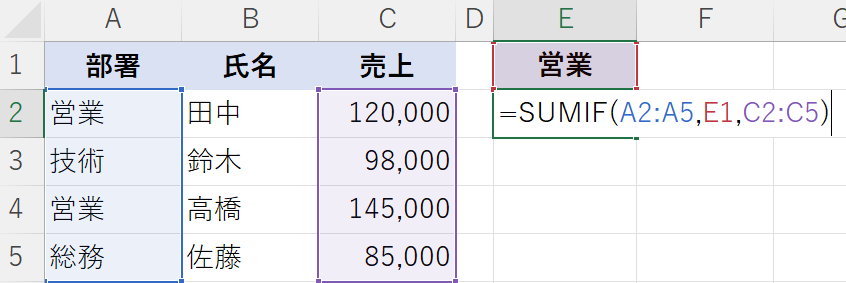 =SUMIF(A2:A10, "営業", C2:C10)