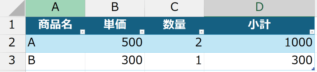 - 数式「=[@単価]*[@数量]」で構造化参照を使って小計を自動計算