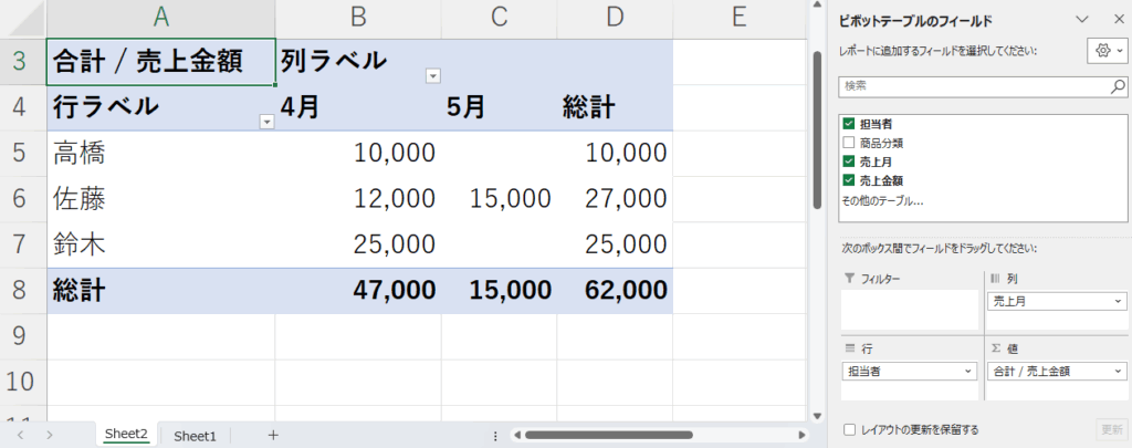 - 「担当者」を「行」に、「売上月」を「列」に、「売上金額」を「値」にドラッグ