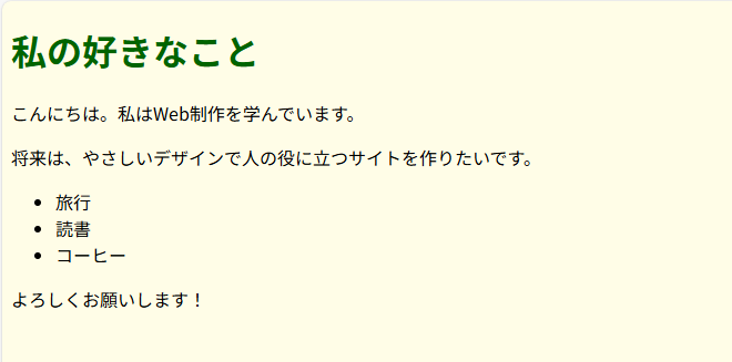 <p>こんにちは。私はWeb制作を学んでいます。</p>